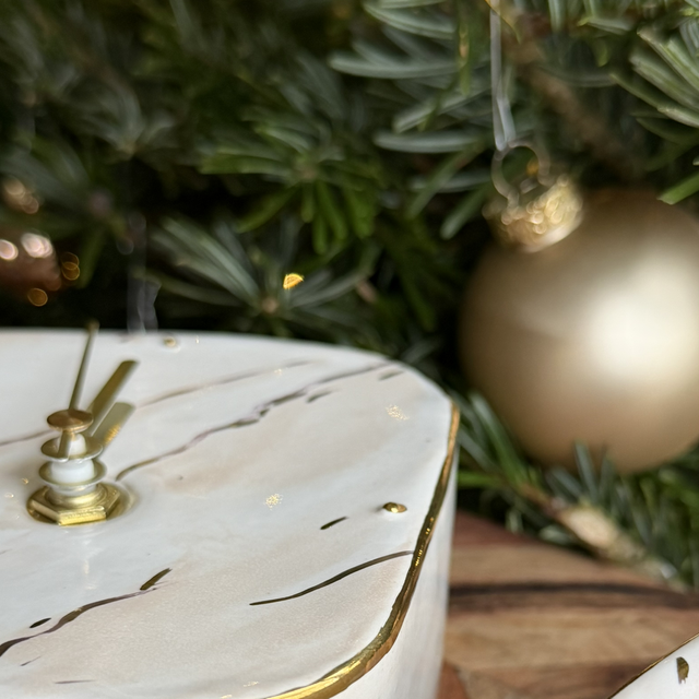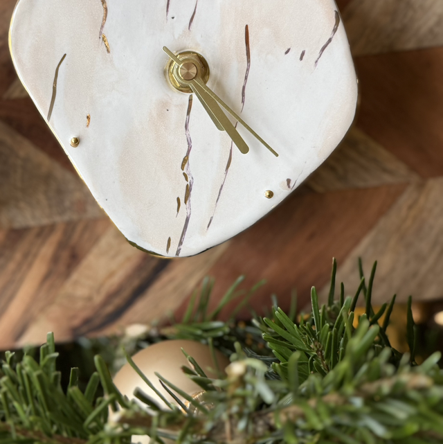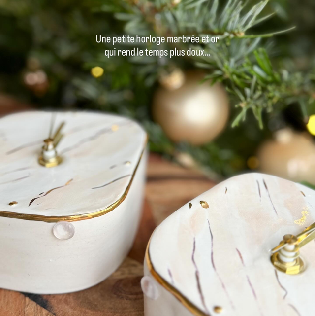 • horloge à poser, en grès blanc, effet marbré en émail et touches d’or veritable